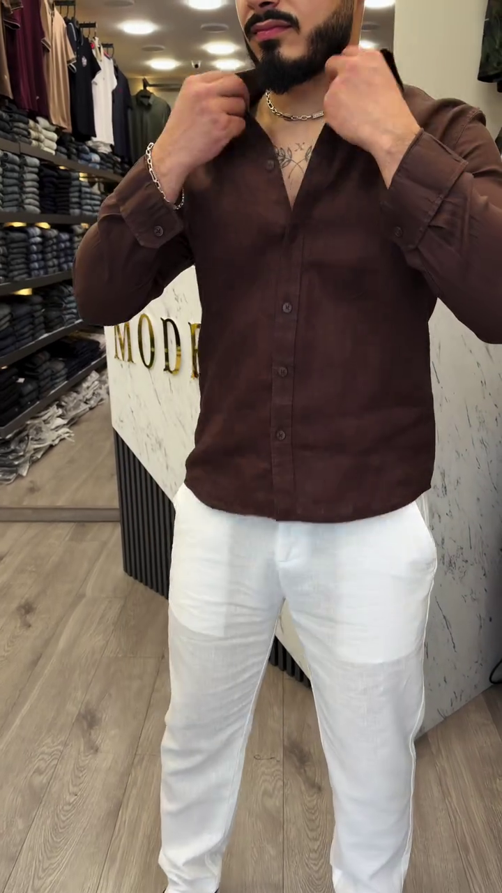 Solid dark brown slim fit shirt made with cotton blend fabric for all-day wear in formal and casual