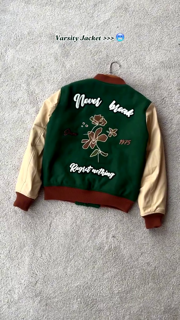 + Free ShippingThis jacket is a modern take on the iconic letterman style. The main body is crafted from a durable dark green fabric, complemented by light, contrasting sleeves. The jacket features: