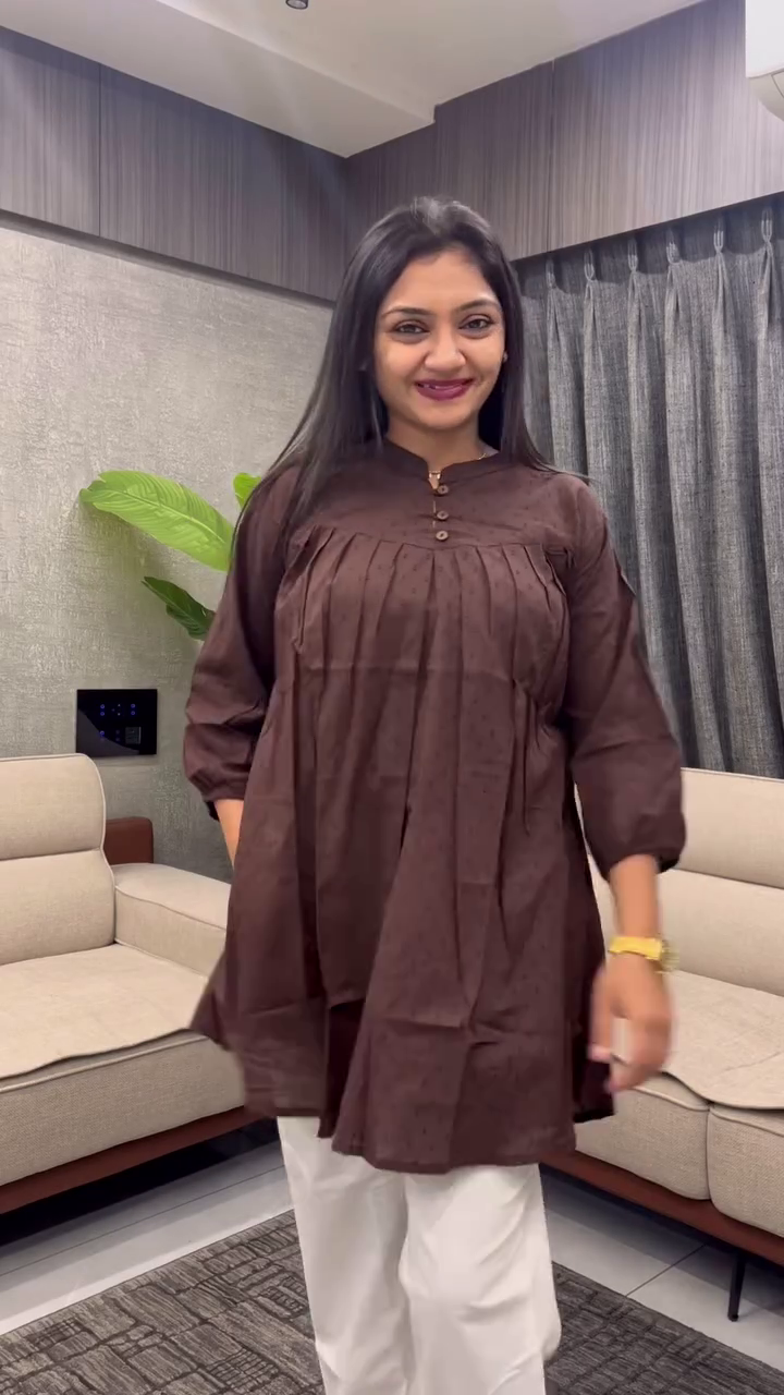 Brown solid a-line tunic, v-neck, three-quarter regular sleeves, Two pockets